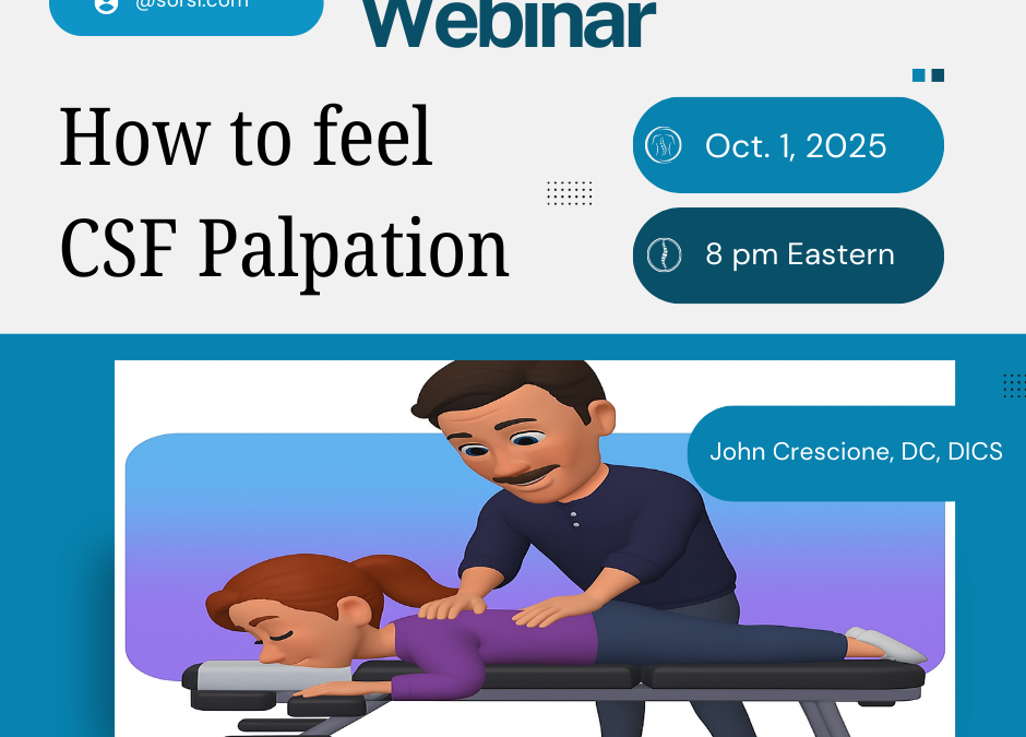 CSF Flow and Cranial Rhythmic Impulse (CRI) is the subtle wave like feeling of cerebral spinal fluid (CSF) moving from the center of the brain outward through the cranium. This class will teach the fine art of feeling this impulse without guess work or imaging.. This class is a must take before going to Homecoming and taking any other cranial classes.This webinar will help develop the palpation skills needed to feel Cranial Bones move, as well as the motion of CSF thru the cranium.